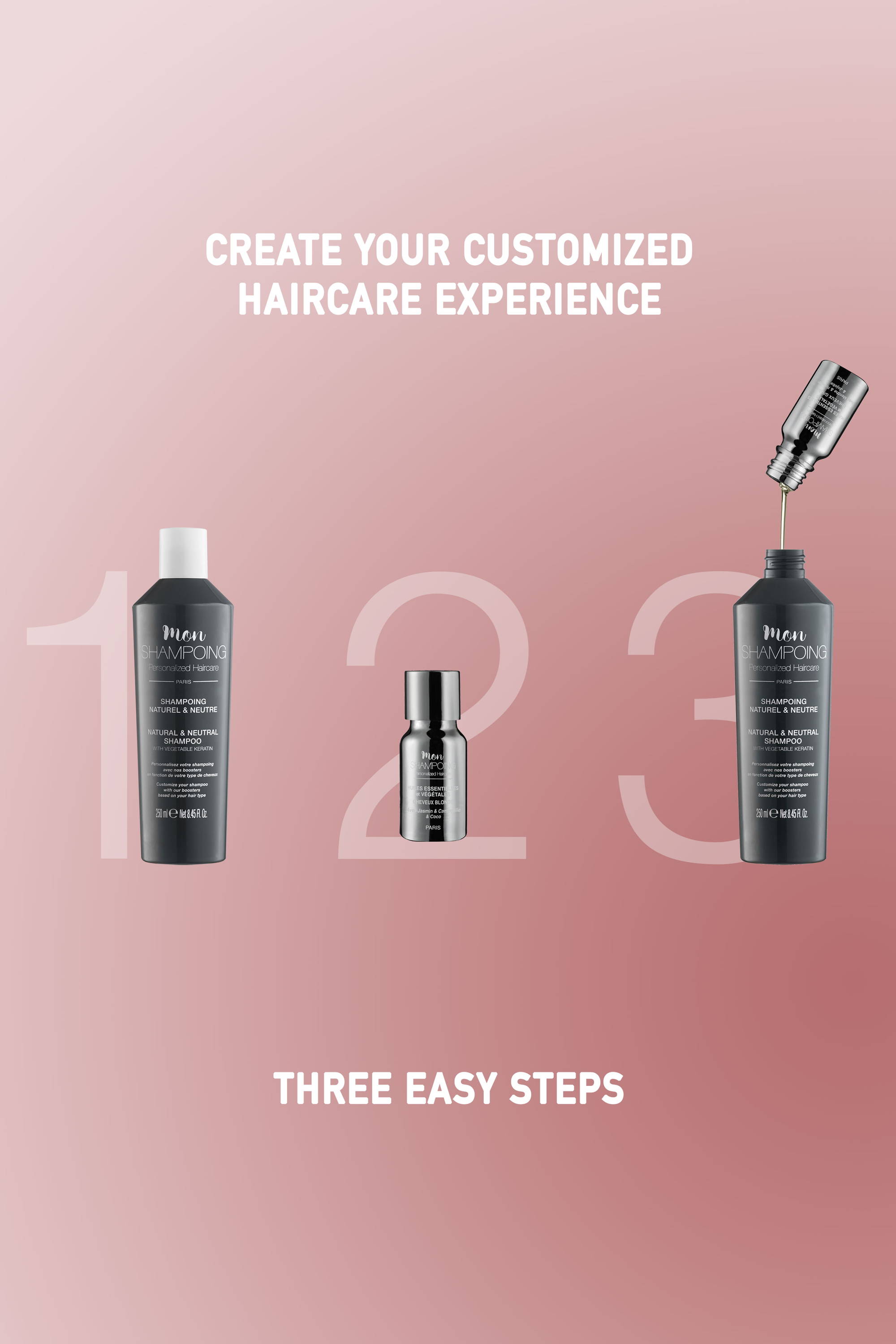 By combining “Mon SHAMPOING”’s natural SLS/PARABEN/SILICONE free Shampoo and conditioner with a vial of selected essential and vegetable oils of various scents and ingredients based on your hair type, you can benefit from an incredible luxurious experience for your daily haircare routine.